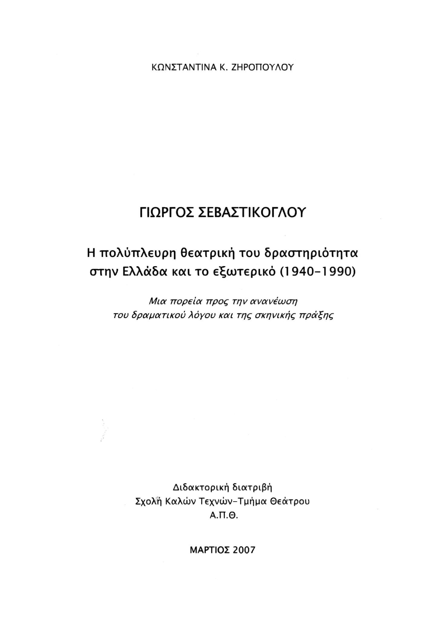 The thesis focused on the polymorphous theatrical activity of Y. Sevastikoglou in Greece and abroad in conjuction with the primary theatrical, social and historical evolution of his time. Merging the pieces of his work as a director, translator and playwright showcases his artistic quality of a contact innovation in the above fields. Also, information on up to now unexplored areas of the history of the Greek postwar theatre is recorded. The testimonies of his colaborators that are included in the thesis (second volume) shed light on the identity of the artist and constitute at the same time a travelogue in modern Greek history, expanding the research towards the field of 'Oral history'