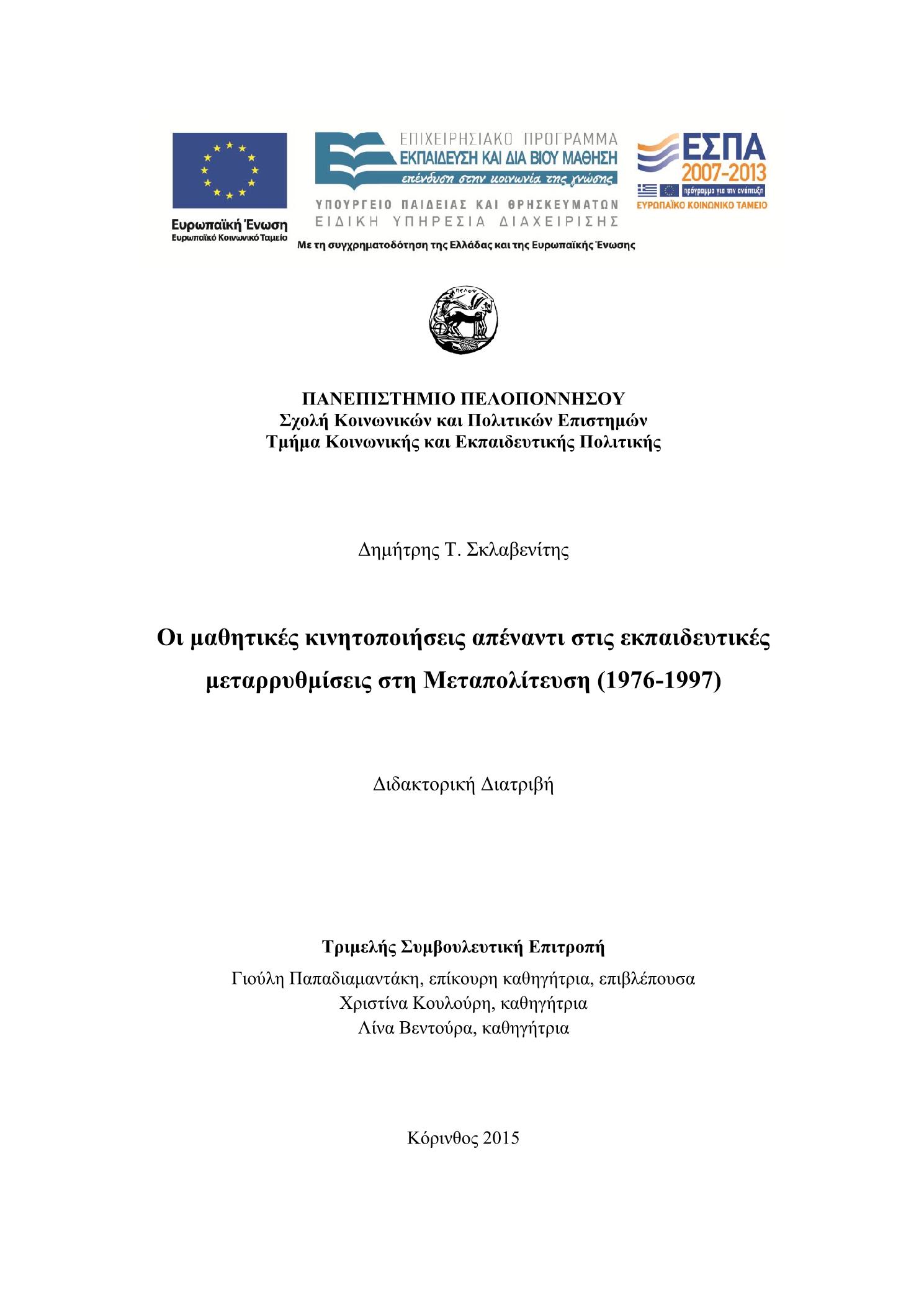 The thesis set as a primary goal the record of high school student protest during the Post Junta period, focusing on educational reforms.The main research hypothesis of the thesis was the emergence of the student youth as a collective-confrontational subject after the fall of the junta, which gradually takes the characteristics of a social movement, i.e. common aspirations, collective consciousness among the activists, prolonged duration of their action, organization etc. Other issues of research were: 1) the students’ reasons for opposing the educational measures, 2) the organization of their mobilizations ‒more preciously the role of the occupation of schools as the basic form of action, which was vital to the formation of the student movement‒, 3) the changes of the educational reforms that caused by the student protest, 4) the relationship between parties and students etc. In order to achieve my research goals, I investigated primary and secondary sources, such as a) student newspa ...