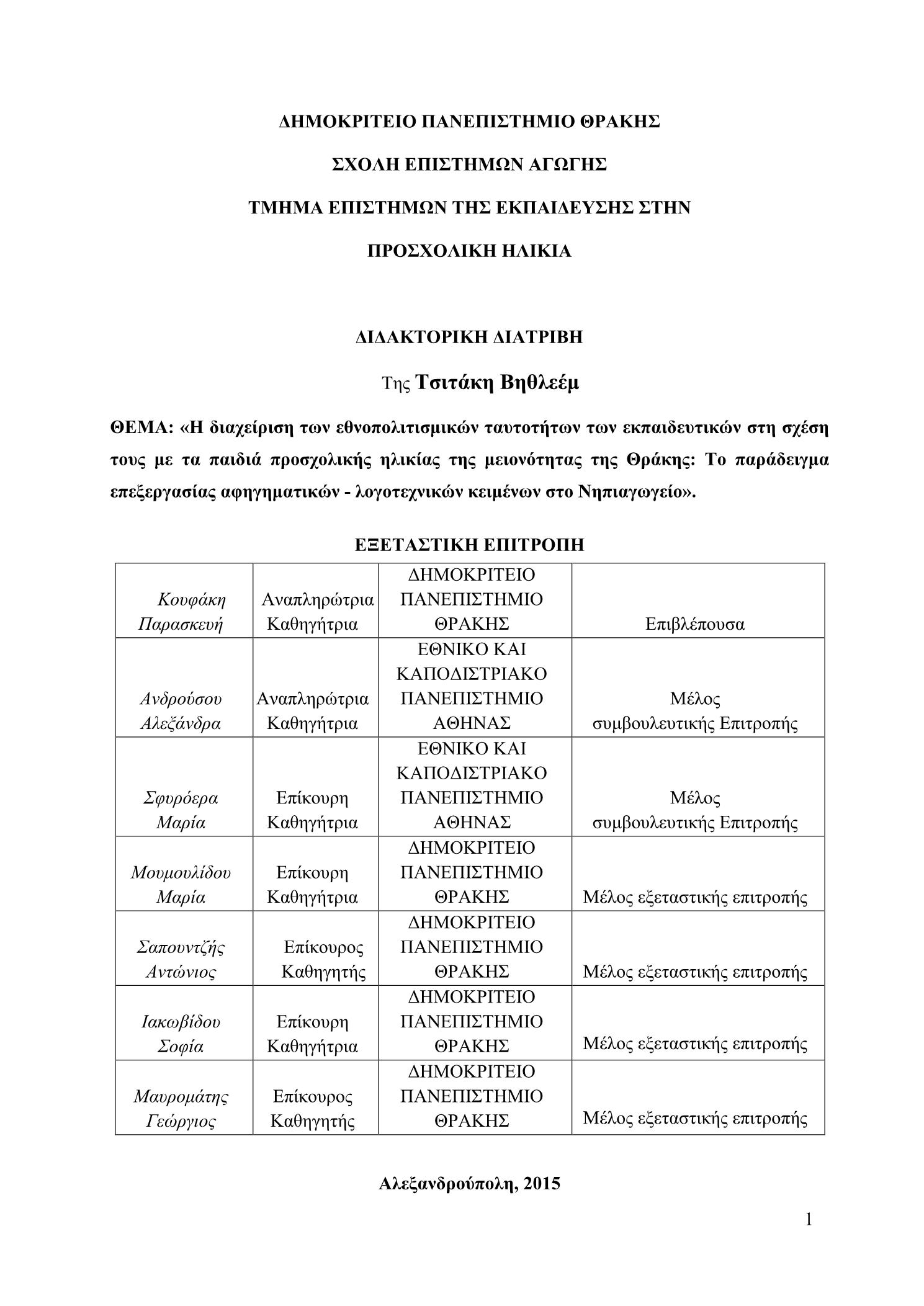 Η διαχείριση των εθνοπολιτισμικών ταυτοτήτων των εκπαιδευτικών στη σχέση τους με τα παιδιά προσχολικής ηλικίας της μειονότητας της Θράκης: το παράδειγμα επεξεργασίας αφηγηματικών - λογοτεχνικών κειμένων στο Νηπιαγωγείο