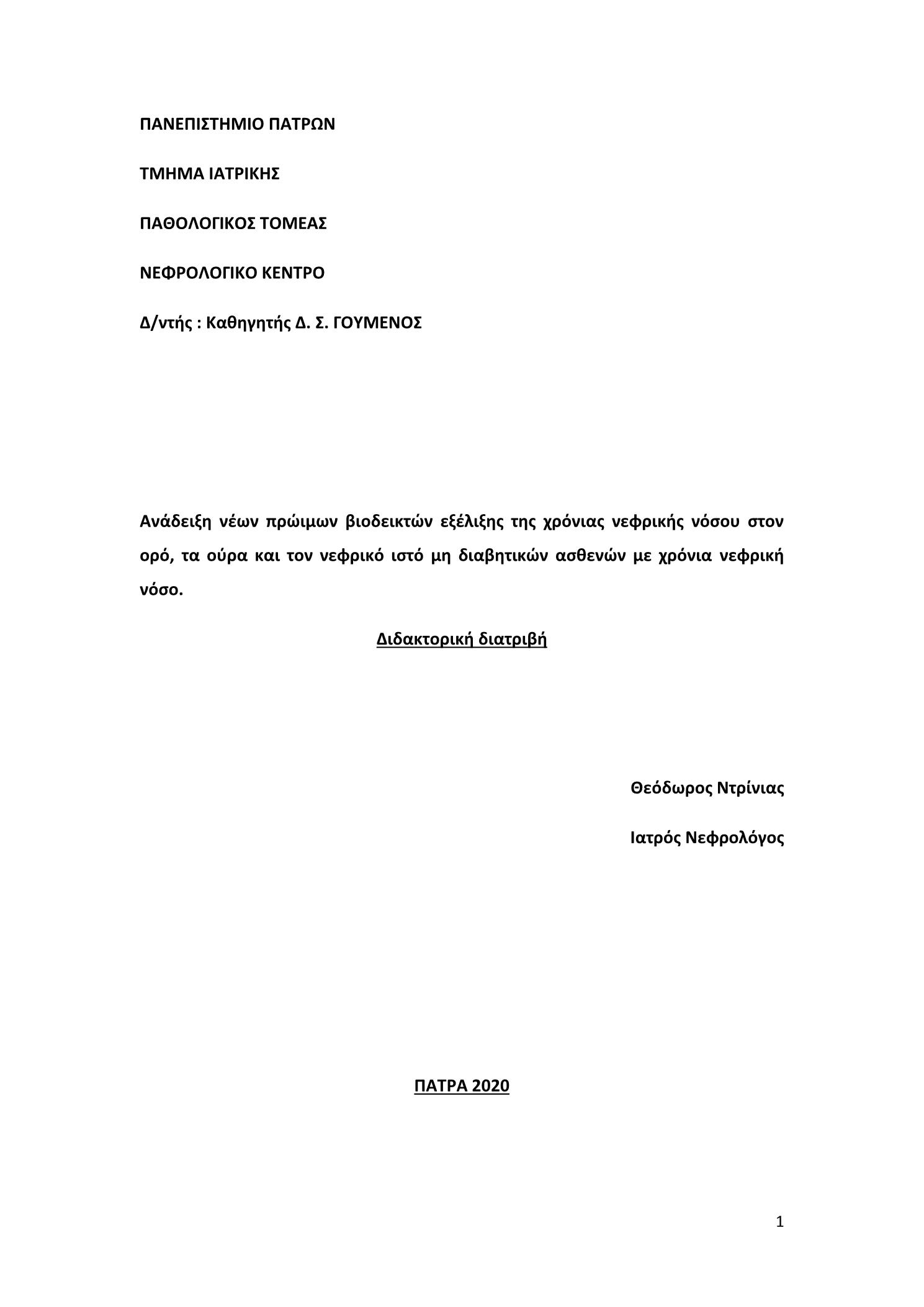 Η ανάγκη έγκαιρης ταυτοποίηση των ασθενών με ΧΝΝ με αυξημένη πιθανότητα να παρουσιάσουν εξελισσόμενη νόσο και Νεφροπάθεια Τελικού Σταδίου είναι επιβεβλημένη. Οι παραδοσιακοί προγνωστικοί δείκτες της ΧΝΝ, ο eGFR και η αλβουμινουρία, παρουσιάζουν σοβαρά μειονεκτήματα, συνεπώς είναι επιβεβλημένη η ταυτοποίηση νέων πιο αποτελεσματικών προγνωστικών βιοδεικτών για την ΧΝΝ. Ως τέτοιοι προγνωστικοί βιοδείκτες μελετήθηκαν οι Clusterin, MCP-1, MMP-9, EGF, COL1A1, KIM-1, TIMP-1 στα ούρα και οι NGAL και suPAR στον ορό 278 ασθενών με ΧΝΝ όλων των σταδίων και διαφόρων αιτίων και σε ομάδα ελέγχου 20 ατόμων. Ο προσδιορισμός των βιοδεικτών έγινε με την μέθοδο ELISA τύπου sandwich. Ανάλογα με την πορεία του eGFR κατά τον χρόνο παρακολούθησης των 20,7 ± 9,9 μηνών οι ασθενείς χωρίστηκαν σε progresors (ΔeGFR> -3,5 ml/min/1,75 m2/έτος) και non- progresors (ΔeGFR≤ -3,5 ml/min/1,75 m2/έτος) και έγινε σύγκριση των επιπέδων των υπό μελέτη βιοδεικτών κατά την έναρξη της παρακολούθησης μεταξύ των ασθενών και της ...