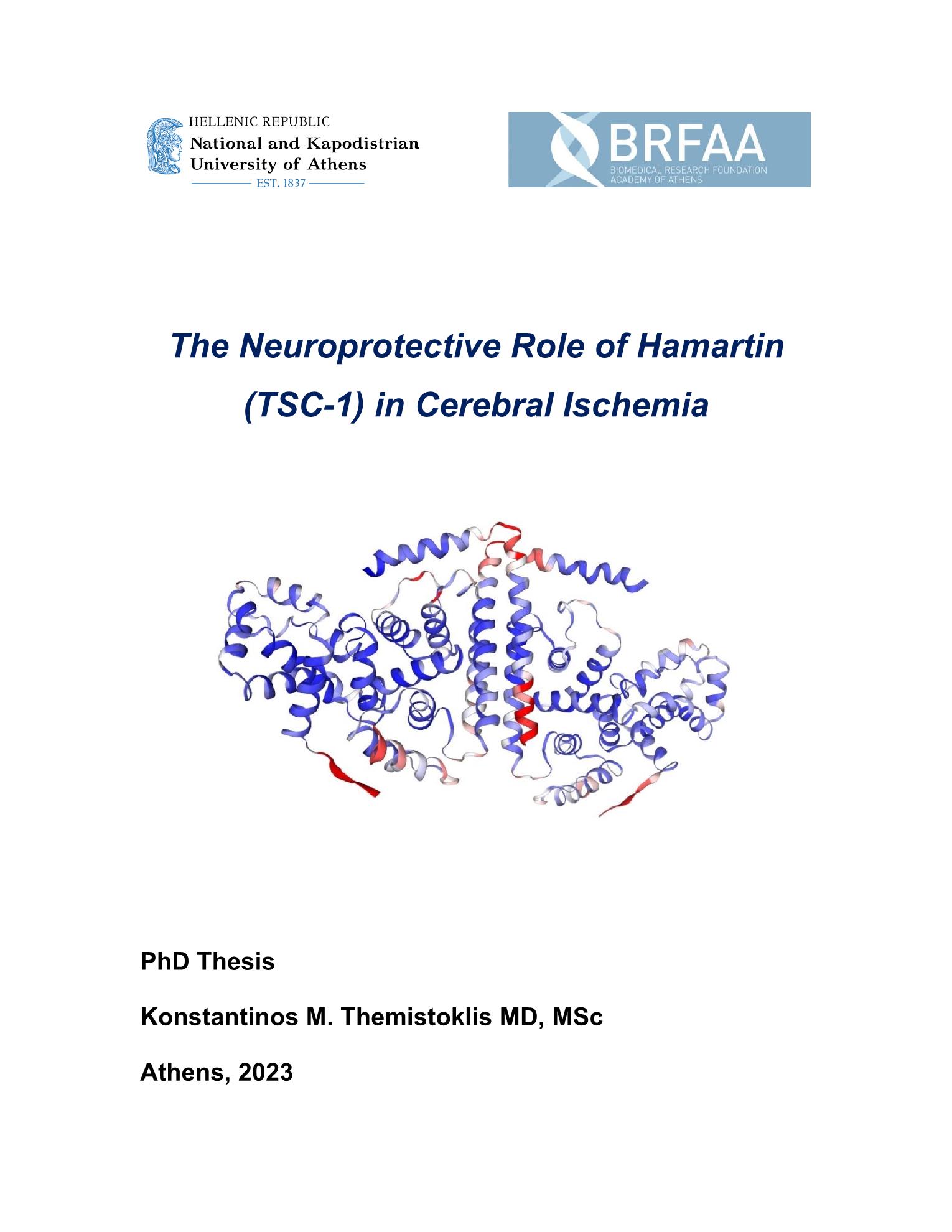 Εισαγωγή: Η hamartin (TSC-1) είναι μια ενδογενής νευροπροστατευτική πρωτεΐνη που βρέθηκε ότι συμμετέχει στην αντοχή των νευρώνων της περιοχής CA3 του ιππόκαμπου επιμύων, μετά από καθολική ισχαιμία του εγκεφάλου τους. Ο κύριος μηχανισμός της νευροπροστατευτικής δράσης της hamartin συντελείται μέσω προαγωγής της παραγωγικής αυτοφαγίας. Η βασική ερευνητική υπόθεση του παρόντος πειράματος είναι, αν η υπερέκφραση της hamartin στο δεξιό εγκεφαλικό ημισφαίριο επιμύων Wistar θα έχει την ίδια νευροπροστατευτική δράση μετά από εστιακή εγκεφαλική ισχαιμία. Υλικό και Μέθοδος: Συνολικά 32 αρσενικοί και θηλυκοί επίμυες Wistar υποβλήθηκαν σε εστιακή ισχαιμία του δεξιού ημισφαίριου τους, με το μοντέλο της παρωδικής απόφραξης της μέσης εγκεφαλικής αρτηρίας με ενδοαυλικό ράμμα. Μεταξύ αυτών, 8 επίμυες είχαν υπερεκφρασμένη την hamartin στο δεξιό τους ημισφαίριο, μετά από στερεοτακτική έγχυση με αδενοϊό που κωδικοποιεί την πρωτεΐνη αυτή. Επίσης, σε 8 επίμυες έγινε έγχυση PBS, σε 8 επίμυες έγινε έγχυση GFP και σε 8 επίμυες δεν πραγματοποιήθηκε έγχυση ουσίας στο δεξιό εγκεφαλικό ημισφαίριο. Η λειτουργική κατάσταση των επιμύων αξιολογήθηκε με συμπεριφορικές δοκιμασίες και πιο συγκεκριμένα με την δοκιμασία του κυλίνδρου και με την δοκιμασία αφαίρεσης κολλητικής ταινίας, πριν και 48 ώρες μετά το ισχαιμικό εγκεφαλικό επεισόδιο. Αποτελέσματα: Η ομάδα των επιμύων με υπερεκφρασμένη την πρωτεΐνη hamartin (TSC-1) παρουσίασε 25% βελτιωμένο ποσοστό θνησιμότητας μετά το εγκεφαλικό επεισόδιο, χωρίς το εύρημα αυτό να είναι στατιστικά σημαντικό. Η ίδια ομάδα επιμύων όμως, παρουσίασε σημαντικά βελτιωμένο ποσοστό ασυμμετρίας των πρόσθιων άκρων (19%) καθώς και σημαντικά αυξημένη κινητικότητα (45 βήματα) μετά το εγκεφαλικό επεισόδιο, σε σύγκριση με την ομάδα Μαρτύρων, PBS και GFP, οι οποίες είχαν αυξημένο ποσοστό ασυμμετρίας και μειωμένη κινητικότητα (52% και 20.2 βήματα), (61% και 13.4 βήματα) και (51% και 16.6 βήματα) αντιστοίχως. Τέλος, οι επίμυες της ομάδας TSC-1 αναγνώρισαν και αφαίρεσαν την κολλητική ταινία στο αριστερό παρετικό πρόσθιο άκρο τους σε σημαντικά λιγότερο χρόνο και με μέσο όρο 49,3 και 170 δευτερόλεπτα αντιστοίχως. Αντίθετα, οι επίμυες της ομάδας Μαρτύρων, PBS και GFP αναγνώρισαν και αφαιρούσαν την ταινία σε 158,2 και 292,6, 181,4 και 290,3 και σε 194,2 και 291,4 δευτερόλεπτα αντιστοίχως. Συμπεράσματα: Η υπερέκφραση της πρωτεΐνης hamartin στο δεξιό εγκεφαλικό ημισφαίριο επιμύων, είχε ως αποτέλεσμα το σημαντικά βελτιωμένο ποσοστό ασυμμετρίας, καθώς και βελτιωμένη την κινητικότητα και αισθητικοκινητική λειτουργία 48 ώρες μετά από εστιακό εγκεφαλικό επεισόδιο στην κατανομή της μέσης εγκεφαλικής αρτηρίας. Κρίνεται απαραίτητη η διεξαγωγή περεταίρω πειραμάτων ώστε να επιβεβαιωθούν τα αρχικά μας ευρήματα, καθώς και για να αξιολογηθεί εάν η hamartin αποτελεί πιθανή φαρμακευτική ουσία για μελλοντικές νευροπροστατευτικές κλινικές δοκιμές.