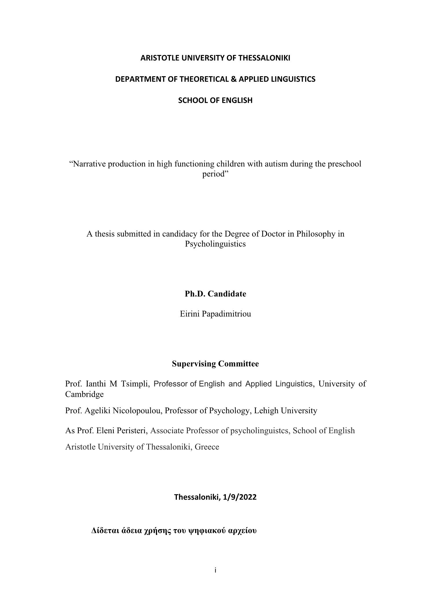 Introduction: The bulk of research examining the narrative production skills of individuals with autism have been compared to groups of typically developing individuals or those with other developmental disorders. In addition, very few studies have compared the narrative skills of children with autism across early childhood. That means we do not know which difficulties are present at early developmental stages so that we can intervene for optimal outcomes. The purpose of this study: The purpose of the study was to investigate the existence of developmental progression for narrative production within early childhood and to identify which component skills present the greatest challenges for mastery in that population. Such insights have value as indicators for directing further research as well for the development of effective intervention strategies in early childhood which can improve overall academic and social outcomes. To the purpose of the study two research questions were examined ...