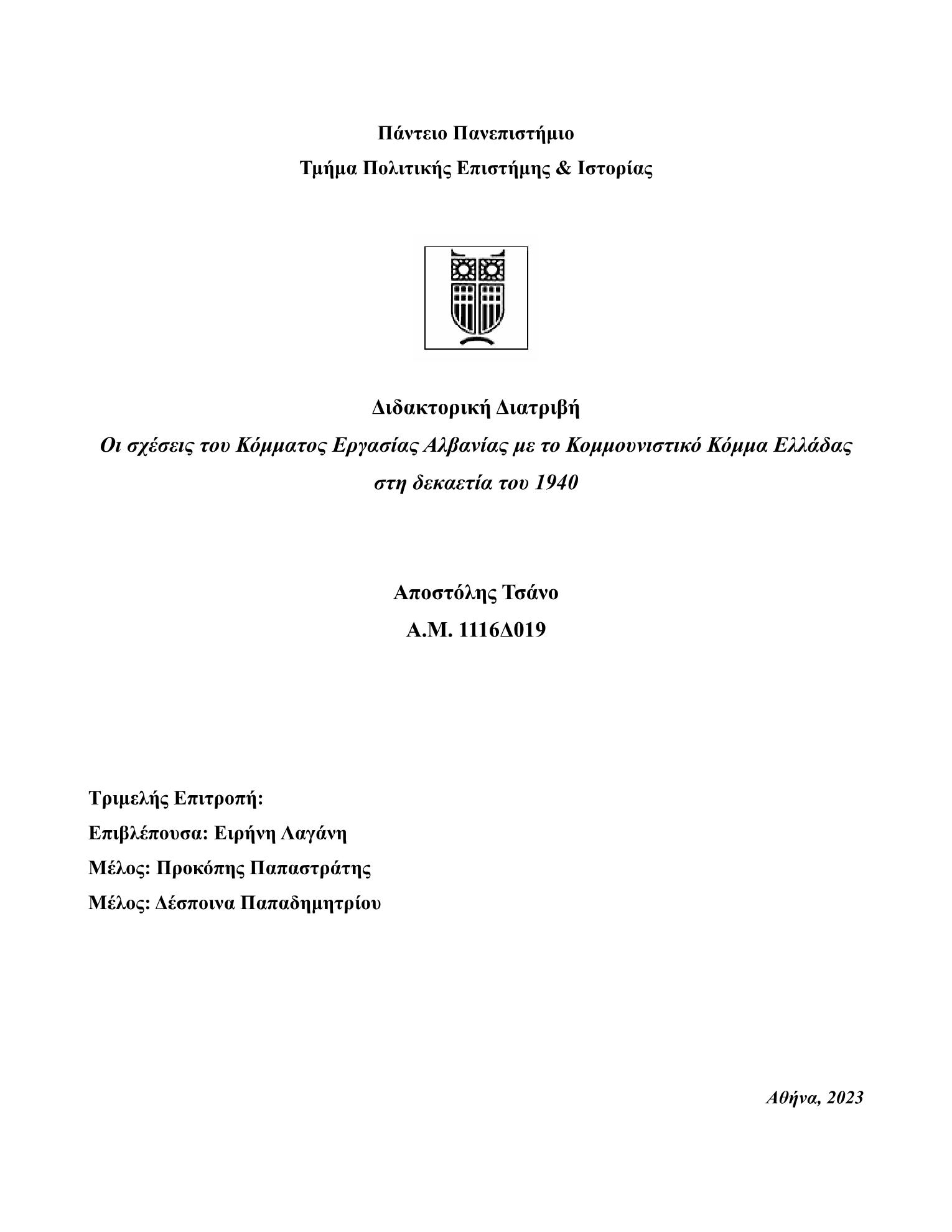 The relations of the Party of Labour of Albania with the Communist Party of Greece in the 1940s constitute an important aspect in the history of the communist movement in the two countries, but also in the history of the Albanian and Greek people. With the cooperation that developed between the Albanian and Greek communists in that very critical decade of the 20th century, an international and joint response to the great political, military, economic and social difficulties that befell the two countries since their conquest by Fascist Italy and Nazi Germany during the Second World War. Their collaboration continued both during the Liberation of the two countries and during the years of the Civil War in Greece in 1946-1949. In addition, the study of the relations between the two parties is of original historiographical interest, since up to now the subject has barely been covered by the Greek, Albanian and international literature.