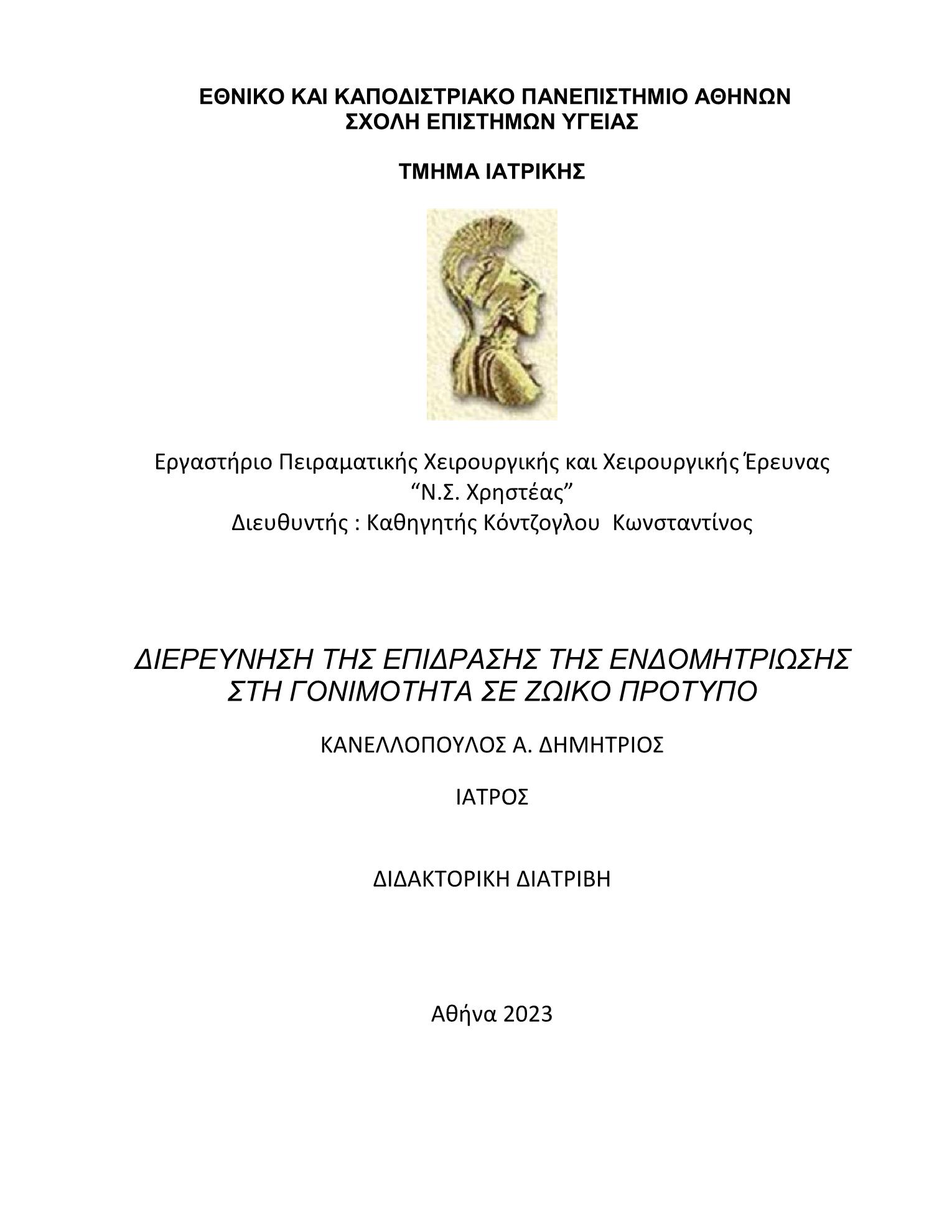 Introduction: Endometriosis is a condition that occurs at the reproductive age of women, in which endometrial tissue (stroma and glands) grows outside the uterus. It is a leading cause of morbidity that largely affects the quality of life of women suffering from it. Endometriosis affects around 10-15 % of women of reproductive age. Despite the increased number of research that has been conducted to better understand endometriosis and the treatment thereof, the exact process of its development has not been clarified and there is no known treatment for effectively eradicating the disease. Materials and Methods: Twenty-four (24) Sprague-Dowley-type female rats, 2.5 months old, weighing 160-180 grams were used in the present doctoral dissertation. The living and handling conditions were in line with Presidential Decrees 160/91, 56/2013 governing the protection of animals used for research purposes. Twelve hours before the surgery all rats were subjected to fasting. On the day of the surger ...