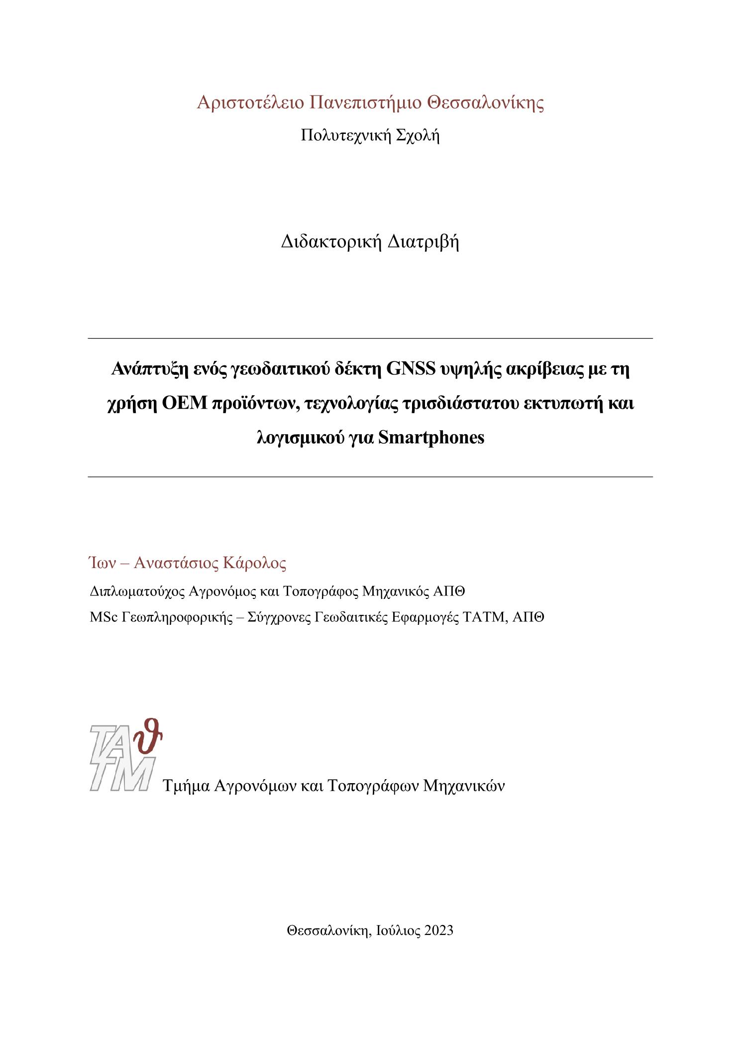 The present doctoral dissertation, “Development of a high-precision GNSS geodetic receiver using OEM components, 3D printing technology and smartphone software”, is structured in six chapters and four appendices. The subject and objectives of this thesis, as well as its originality, are briefly outlined in Chapter 1. The primary goal was to create two receivers, one as a permanent reference station and one as a rover. Chapter 2 investigates recent 3D printing processes in depth, with focus on the FFF/FDM technique, which was used to create the enclosures of the receivers developed in the framework of this thesis. Chapter 3 thoroughly covers all stages of the receiver's development as a permanent reference station. The third chapter describes all the different electronic components that comprise the receiver, as well as their connections. Simultaneously, it thoroughly specifies the steps of design and additive manufacturing of the components that comprise the receiver's housing, as well as the processes of assembly of the electronic components within the housing. The receiver management software development is also described. In addition to this chapter, the receiver's anticipated production cost is mentioned, and its technical attributes are compared to those of a commercial, third-party manufacturer receiver. Finally, Chapter 3 explains how to install and use the receiver as a permanent reference station. The organization of Chapter 4 is identical to that of Chapter 3, and it examines the stages of development of the rover receiver. The quality of the raw and derived GNSS data for the two receivers created in this thesis is examined in Chapter 5. Using a zero-baseline configuration, the receiver's raw data as a permanent station is compared with the corresponding commercial GNSS receiver using appropriate software for quality control and calibration. Chapter 5 also includes simple differences error estimates for all receiver supported GNSS systems, as well as matching carrier frequencies for phase measurements. Chapter 5 continues with the quality control stages of the mobile GNSS receiver, which include the quality control of the extracted raw data for a set period, receiver calibration according to the international standard ISO 17123-8, and further investigation of the reliability of the NRTK technique at selected reference sites. The investigation is conducted by comparing the derived NRTK position of the specified reference sites from the rover receiver developed for this dissertation to the matching NRTK positions of two other commercial mobile receivers. In chapter 6, the conclusions drawn from the preparation of this thesis are summarized. Annex A includes all the electromechanical components and consumables used for the development of the receivers. Annex B contains the source code on which the functionality of the receivers is based. Appendix C includes the wiring diagram of the electronic components of the rover receiver motherboard. Finally, appendix D includes the ISO 17123-8 certificate of the rover GNSS receiver.
