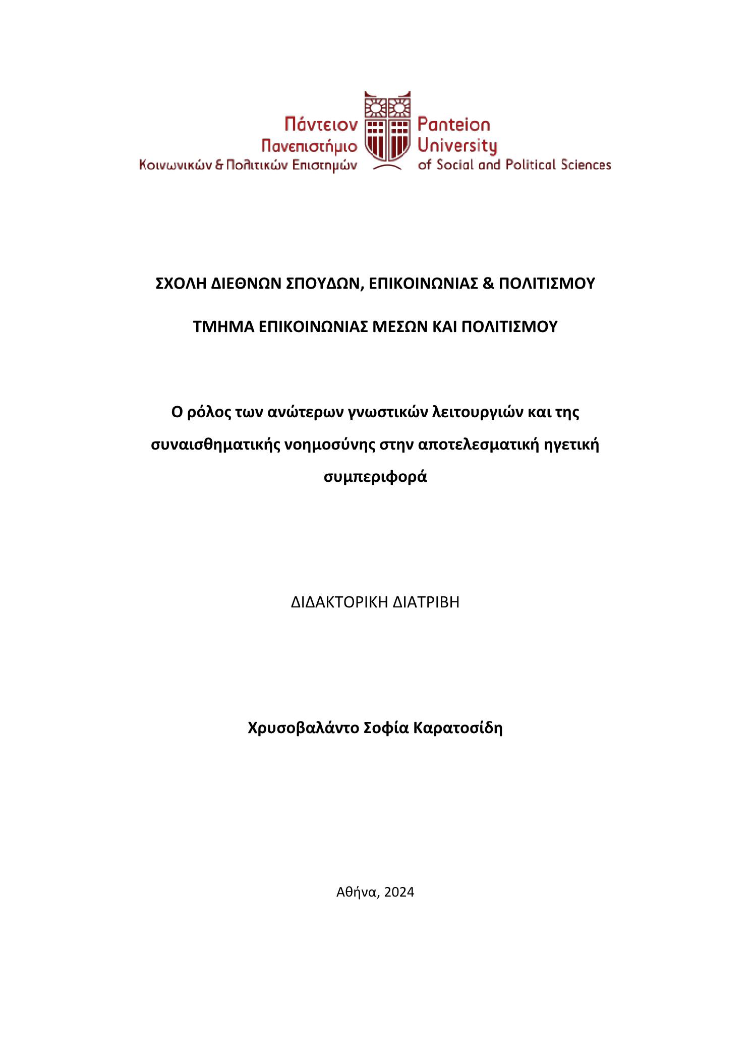 Η παρούσα διδακτορική διατριβή διερευνά τις σχέσεις εγκεφάλου-συμπεριφοράς στην ηγεσία, εισάγοντας τις επιτελικές λειτουργίες ως ατομική διαφορά. Εμπειρικά δεδομένα επιβεβαιώνουν ότι οι γνωστικές λειτουργίες όπως, η επίλυση προβλήματος, η ταχύτητα επεξεργασίας, η ενεργός μνήμη, η αυτοβιογραφική μνήμη παίζουν σημαντικό ρόλο στην αποτελεσματική ηγεσία (Ramchandran και συν., 2016; Foxall, 2014; Waldman, 2011). Ωστόσο υπάρχει ανάγκη περαιτέρω διερεύνησης του νευρογνωστικού προφίλ της ηγεσίας καθώς η υπάρχουσα βιβλιογραφία είναι μέχρι στιγμής αμφιλεγόμενη. Οι επιτελικές λειτουργίες παίζουν σημαντικό ρόλο στην ικανότητα απόκρισης και προσαρμογής σε νέες καταστάσεις, αποτελούν την βάση πολλών γνωστικών, συναισθηματικών και κοινωνικών δεξιοτήτων και εμπλέκουν τον προμετωπιαίο φλοιό. Οι ψυχρές επιτελικές λειτουργίες εκδηλώνονται σε συνθήκες απαλλαγμένες από συναίσθημα και σε ελεγχόμενα περιβάλλοντα. Οι θερμές επιτελικές λειτουργίες αναδύονται σε περιβάλλοντα που εμπλέκουν συναίσθημα, κίνητρο, ...