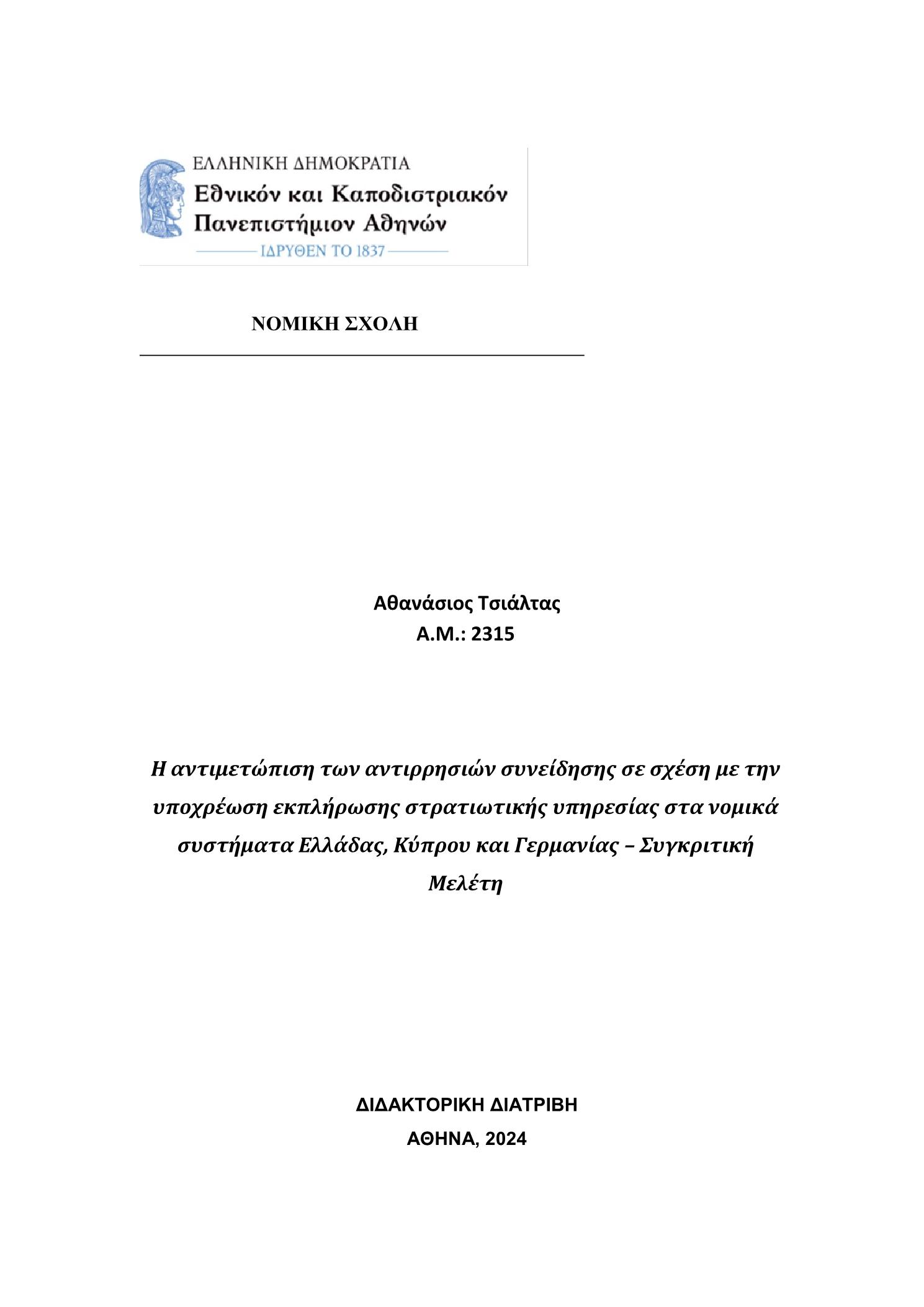 Freedom of conscience in European history over the centuries resulted to constitute a universally recognized right. It does not consist only of the conscious choice of a person to adopt a certain life attitude based on religious, philosophical, ideological, humanitarian or political beliefs, but also of the possibility to adjust these beliefs in such a way that no socially protected good is harmed. In the modern legal world, freedom of conscience is protected as a right both in the international context and constitutionally at the state level. Every modern organized state includes at its hard core an organized military structure, the Armed Forces. Conscientious objection manifests itself as opposition to what the legal order can impose as an obligation. In this particular thesis, the object of research is the conscientious objection in relation to compulsory military service, which is imposed by the state through specific rules of law. It is emphasized, however, that conscientious objection is not inextricably linked to military service, but is only a form of its manifestation. There are forms of conscientious objection in the medical field as well. Those who refuse to serve in the Armed Forces by bearing arms and military identity due to their religious or ideological beliefs are therefore classified as conscientious objectors in terms of conscription. The genuine beliefs of conscientious objectors are those which differentiate them from those who simply wish to avoid compulsory military service. Besides, the vast majority of conscientious objectors wish to contribute to national defense by performing alternative service. The research is structured at three levels, international, European and national. At the international level, the acts of the organs of the United Nations reflect the legal framework for the protection of conscientious objection as a right. At the European level, the protection of conscientious objection is evident in the European Convention on Human Rights, the jurisprudence of the European Court of Human Rights and the legislative output of the European Union institutions. At the state level, the research focuses on the influence of conscientious objection in the administrative, constitutional and criminal legal spheres and how it has influenced both legislative production and jurisprudential practice in Greece, Cyprus and Germany. The comparison of the state laws under investigation is a separate part of the thesis. The comparative study at the level of legal rules and jurisprudence includes, on the one hand, the influence of compulsory conscription on the legislative recognition of conscientious objection, and on the other, the legislative framework of each country regarding the provision of alternative service. However, beyond the legal rules and their application, it was deemed necessary to investigate the historical and social context within which they were implemented, as well as the influence of the geographical location and the ruling religious concepts in the three states. Finally, an analysis is attempted as to whether the legal regulations of the countries under consideration coincide with the provisions of international and European texts. The objective of the comparative study is to understand as well as possible both the positive arrangements and the shortcomings presented in the legal treatment of conscientious objection in the three states. In addition, the investigation of the social, historical, geographical and religious conditions that shaped the application of the rules of law, which differed in each state and, depending on their specificities, positively or negatively affected the acceptance of conscientious objectors and, by extension, the formation of the legal framework that protects them. From the combination of all the above and the exposure of examples, the importance of both armed military service and alternative service in the contribution to national defense and to the well-being of society in general emerges.