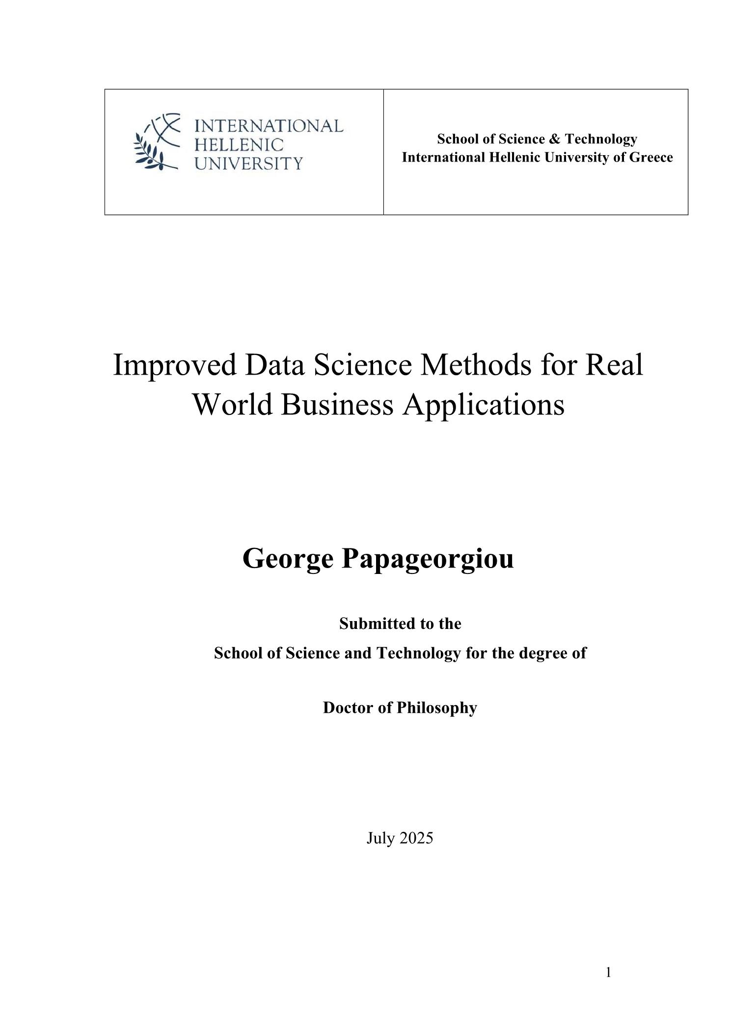 Η Επιστήμη Δεδομένων (Data Science – DS) αποτελεί θεμελιώδη πυλώνα σε όλους τους βιομηχανικούς κλάδους, καθώς οι επιχειρήσεις βασίζονται σήμερα περισσότερο από ποτέ σε πληροφορίες που προκύπτουν από ανάλυση δεδομένων για τη λήψη αποφάσεων. Ποικίλες μεθοδολογίες εφαρμόζονται στα δεδομένα της βιομηχανίας, συχνά με πολλαπλές παραλλαγές, με στόχο την εξαγωγή πολύτιμων γνώσεων που μπορούν να μεταφραστούν από τα αντίστοιχα ενδιαφερόμενα μέρη σε εφαρμόσιμες επιχειρηματικές αποφάσεις. Ωστόσο, οι τεχνολογικές εξελίξεις και οι ερευνητικές καινοτομίες καθιστούν αναγκαία τη διερεύνηση νέων μεθοδολογιών, προκειμένου να ενισχυθεί η πρόοδος στην έρευνα γύρω από την Επιστήμη Δεδομένων (DS), την Εξόρυξη Δεδομένων (Data Mining – DM) και τη Μηχανική Μάθηση (Machine Learning – ML) με εφαρμογές σε πραγματικά επιχειρησιακά δεδομένα. Η παρούσα διατριβή αποσκοπεί στη διερεύνηση τριών βασικών πυλώνων και στην εισαγωγή μεθόδων που έχουν σχεδιαστεί ώστε να βελτιώσουν τις εφαρμογές της DS και της DM σε επιχειρημα ...
